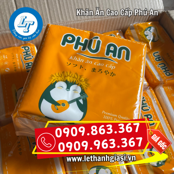 Tại TP.HCM, Công ty Lê Thanh là đơn vị chuyên cung cấp sỉ khăn ăn Phú An chính hãng, được nhiều đại lý, nhà hàng và quán ăn lớn nhỏ tin tưởng lựa chọn. Với lợi thế nhập hàng trực tiếp từ nhà sản xuất, Lê Thanh cam kết mang đến giá sỉ tốt nhất thị trường, chất lượng ổn định, giấy trắng mịn, thấm hút tốt và bao bì đẹp mắt. Nhờ nguồn hàng dồi dào, luôn có sẵn tại kho, khách hàng dễ dàng đặt mua số lượng lớn mà không lo thiếu hụt hay chậm trễ trong giao hàng.