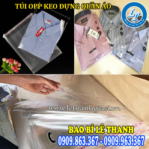Túi OPP keo đựng quần áo hay còn gọi là túi bóng kính đựng quần áo có keo dán miệng túi. Dạng này thích hợp cho việc gấp xếp gọn gàng từng chiếc áo sơ mi bỏ vào từng chiếc túi, và sau đó chỉ cần thao tác đơn giản lột lớp ni lông có keo ngay miệng túi và dán lại. Giờ đây việc đóng gói sản phẩm đã trở nên dễ dàng hơn bao giờ hết.