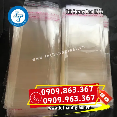 - Kích thước túi OPP dán miệng: Đựng vừa bao lì xì thông dụng với size 9×18cm gấp 4cm và 10×20cm gấp 4cm; mỗi túi đựng tối đa khoảng 10 bao lì xì. Bên cạnh đó, khách hàng có thể đặt sản xuất kích thước túi riêng tùy theo nhu cầu.